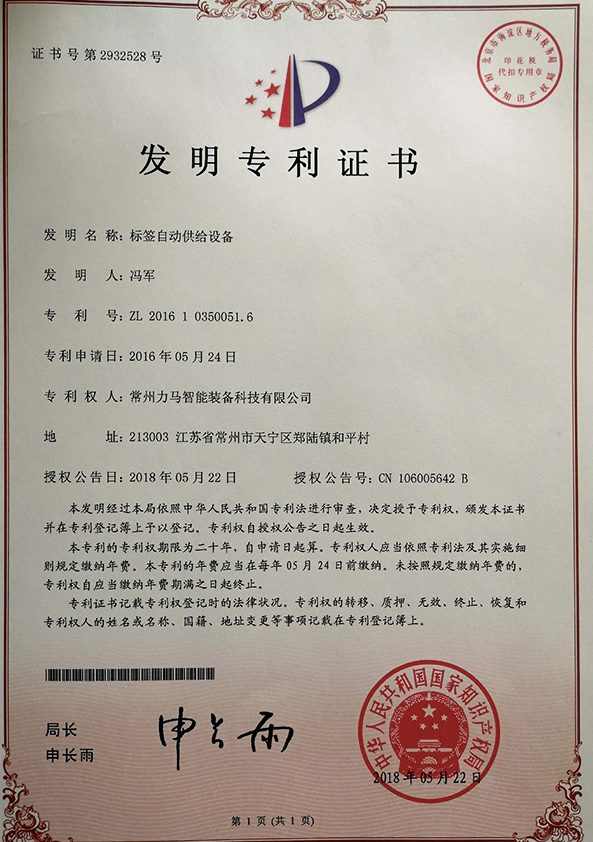 專利證書(標(biāo)簽傳送裝置)