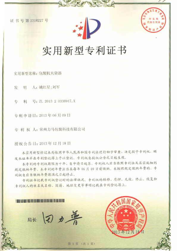 包裝機(jī)夾袋器專利證書