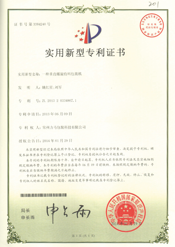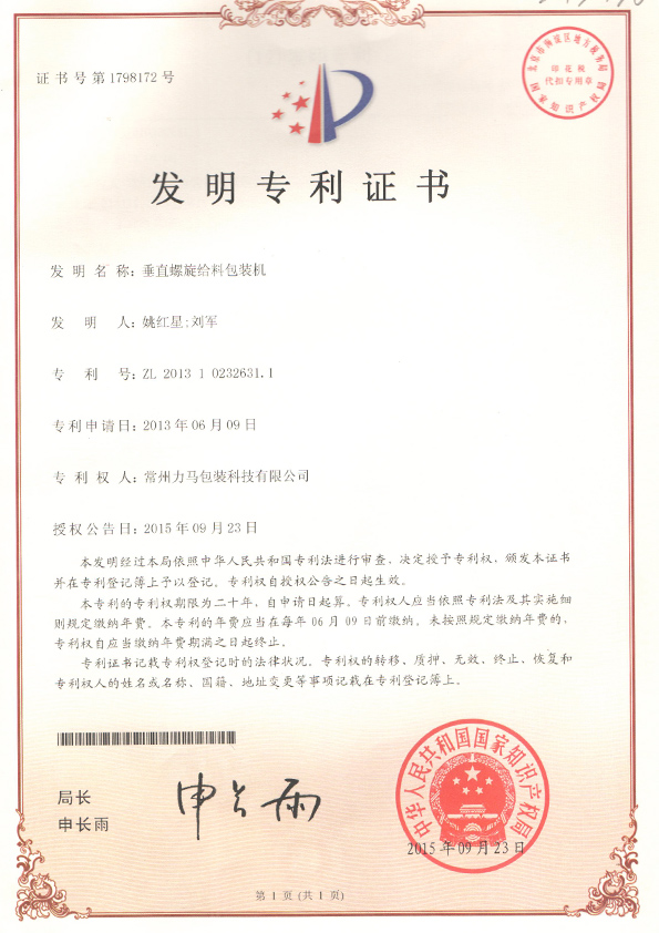 垂直羅螺旋給料包裝機(jī)專利證書