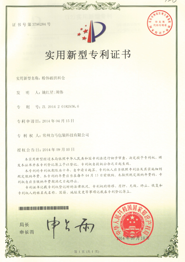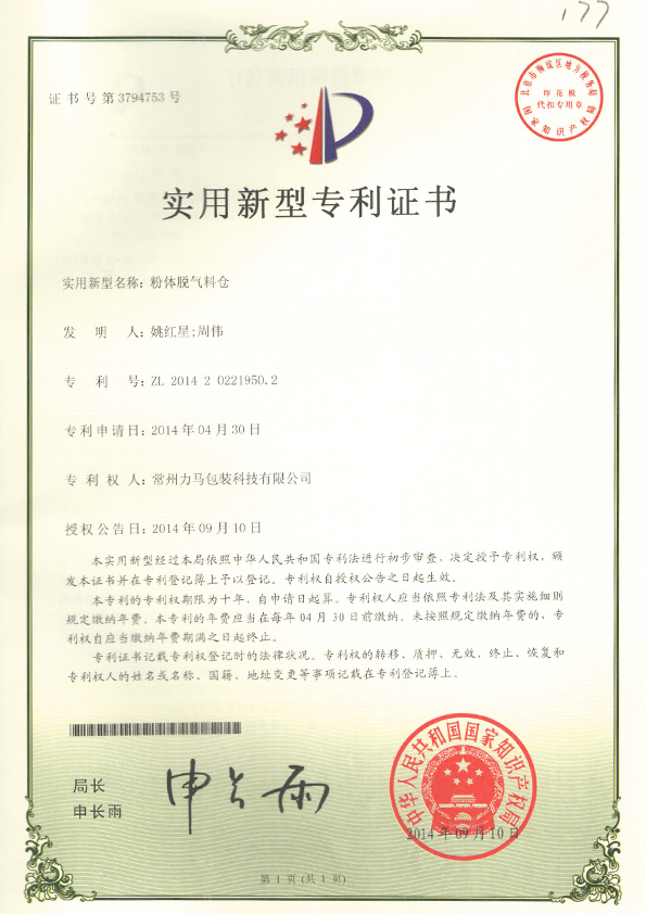 粉體脫氣料倉(cāng)專利證書