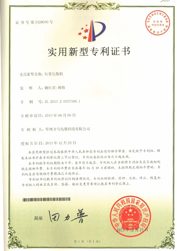 垂直螺旋包裝機(jī)專利證書